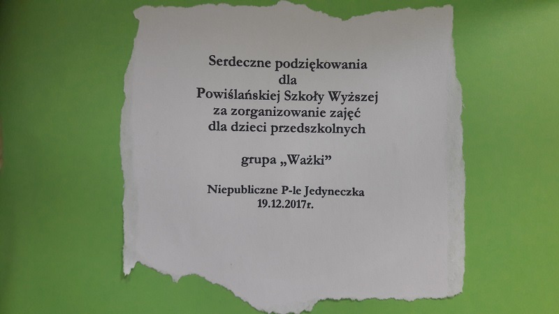 W dniu dzisiejszym, tj. 19.12.2017 r. Powiślańska Szkoła Wyższa gościła w swoich murach pięcio i sześcioletnie dzieci z przedszkola „Jedyneczka” z grupy „Ważki”.