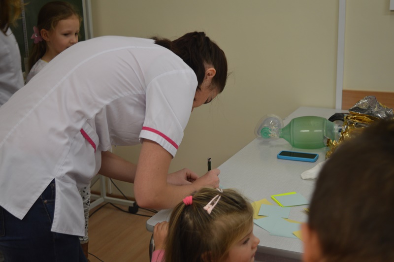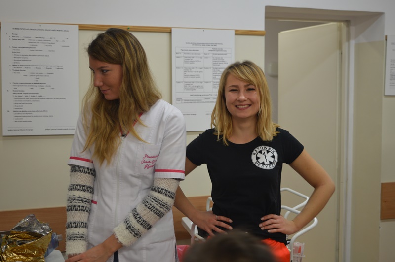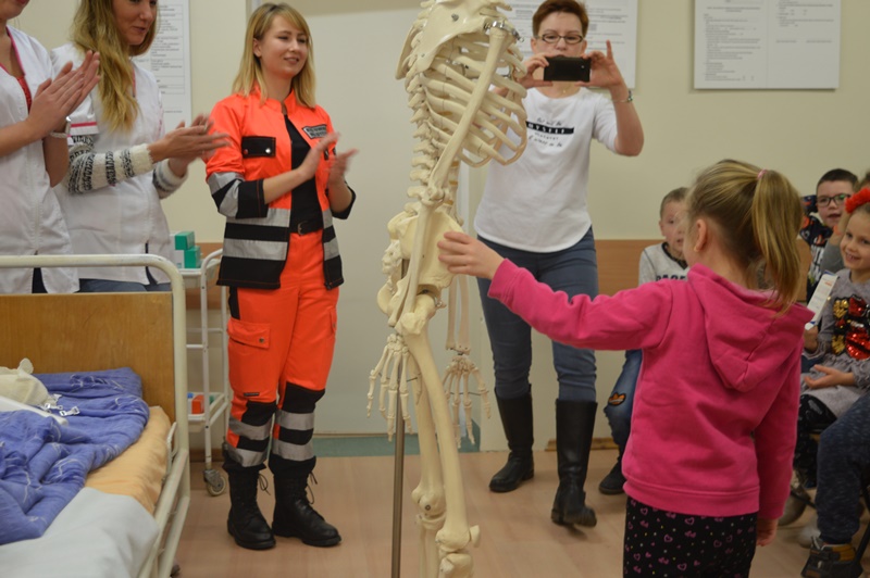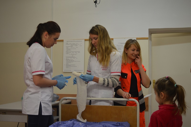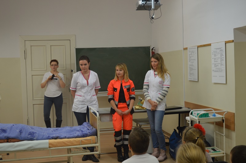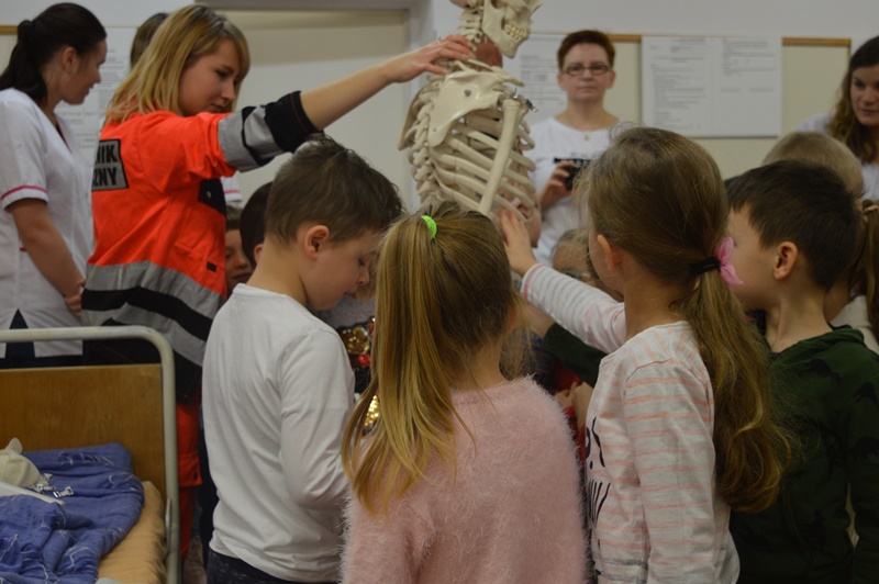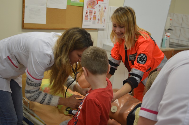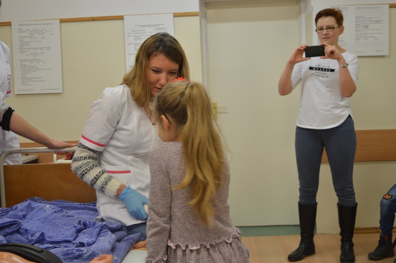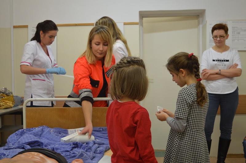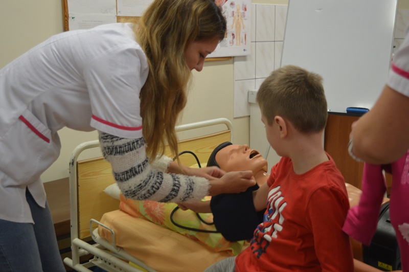 Po oprowadzeniu maluchów po uczelni, grupa naszych studentów pielęgniarstwa oraz ratownictwa medycznego zorganizowała przemiłe spotkanie w sali zajęć praktycznych.