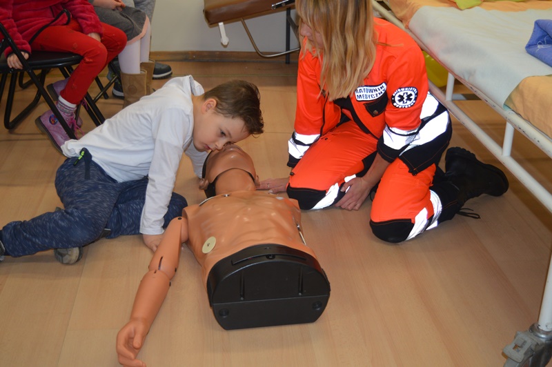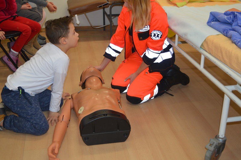 Podczas wizyty dzieci odpowiadały na szereg pytań związanych z ratownictwem i pielęgniarstwem. Studenci przeprowadzili pokazy pierwszej pomocy, w których dzieci mogły brać czynny udział, tak więc mogliśmy podziwiać maluchów podczas bandażowania, badania ciśnienia, sztucznego oddychania itd. Wszystkie przedszkolaki zostały zważone i zmierzone, a na koniec spotkania pożegnaliśmy ich małym poczęstunkiem.
