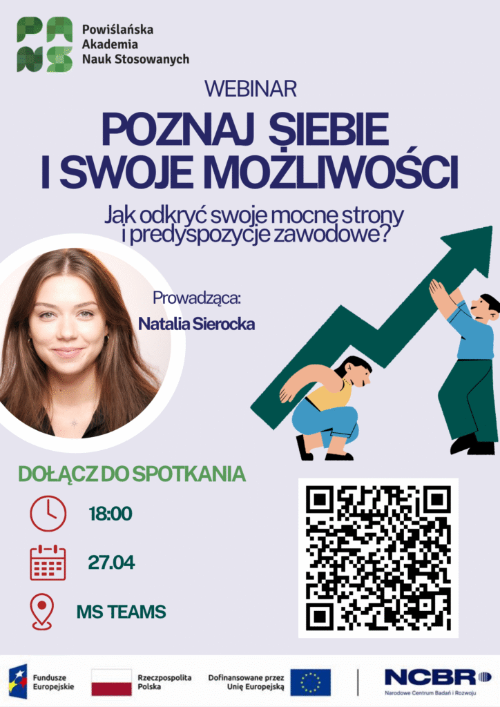 Centrum Karier serdecznie zaprasza całą społeczność akademicką do udziału w wyjątkowym wydarzeniu online, które pomoże Państwu świadomie zaplanować pierwsze kroki na rynku pracy. Webinar zatytułowany „Poznaj siebie i swoje możliwości – jak odkryć swoje mocne strony i predyspozycje zawodowe” poprowadzi pani psycholog Natalia Sierocka. Celem spotkania jest wsparcie studentów w procesie budowania samoświadomości oraz identyfikacji kluczowych zasobów osobistych, które stanowią fundament udanej kariery.